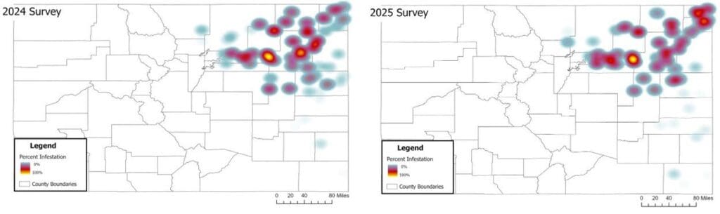 Figure 2: Heat maps comparing Colorado WSS infestation in 2024 and 2025.