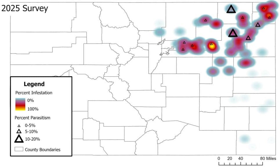 In Kansas, similar to the Colorado survey, we dissected 100 tillers at each site to identify the presence of WSS larvae. Infestation levels were classified using the same criteria as in the Colorado survey. In the past, Kansas had low to no-infestation; however, infestation has been increasing since 2024.