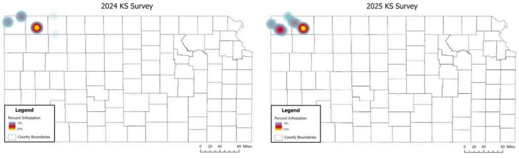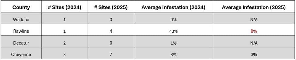 In 2025, populations remained relatively unchanged, with most counties experiencing only minor changes in infestation levels (Figure 2). However, Sedgwick, Lincoln, and Phillips counties saw significant increases in infestation, while Washington County experienced a decrease (Table 2). The average infestation rate for the entire state was 25.4%, which is a small decrease from 27.4% in 2024.