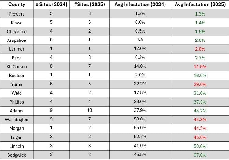 Table 2: Colorado survey sites and infestation averages per county in 2024 and 2025.