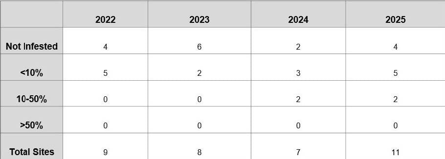 From 2013 through 2025, survey data indicated an increase in the proportion of infested sites. This included a notable rise in locations with medium and high infestation levels (Table 1).