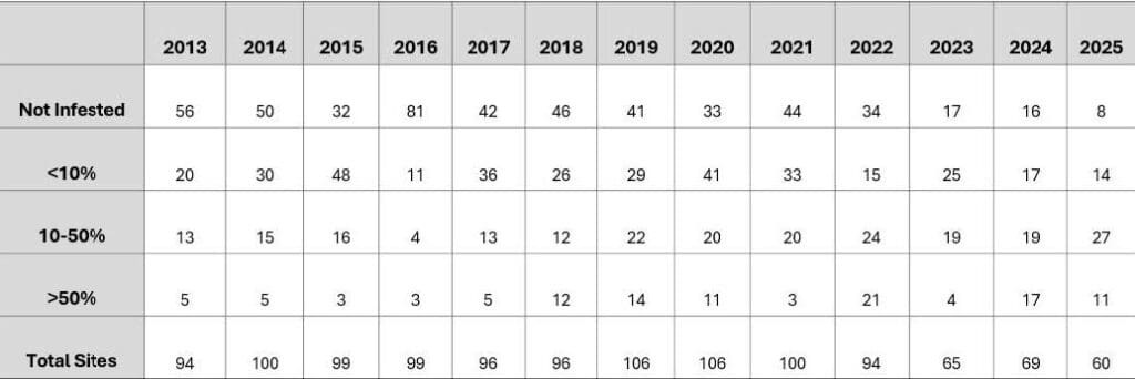 From 2013 through 2025, survey data indicated an increase in the proportion of infested sites. This included a notable rise in locations with medium and high infestation levels (Table 1).